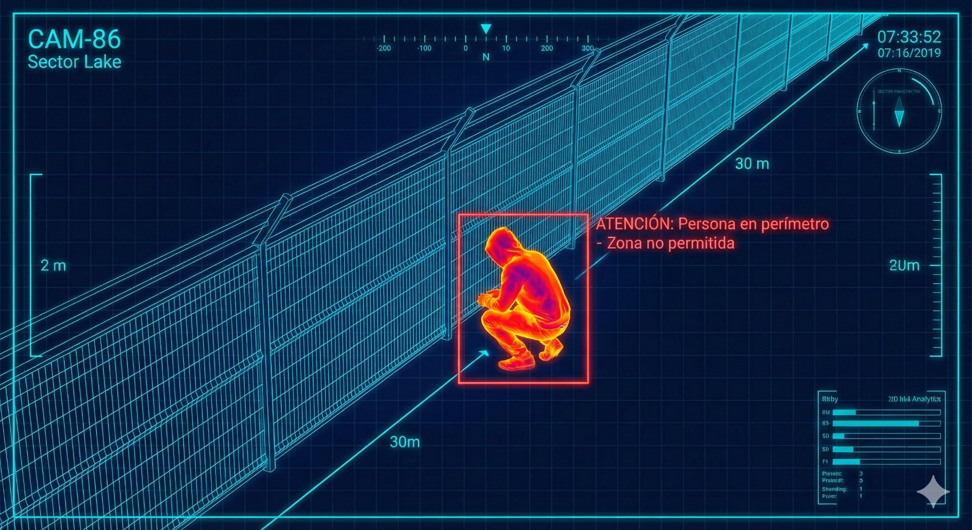 Detección de movimiento en el cerco antes de que el intruso toque suelo interior. Alerta en segundos.